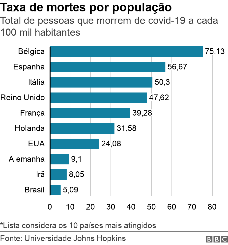 Os dados são do site Our World in Data da Universidade Johns Hopkins e foram analisados pelo demógrafo José Eustáquio Alves. Uma delas é a medida de mortes por 100 mil habitantes que leva em conta o tamanho da população e por isso é uma maneira eficaz para se avaliar o avanço da doença em locais diferentes. Brasil supera EUA em mortes de covid-19 por 100 mil habitantes.