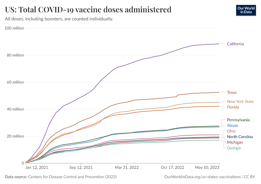 For first vaccine doses given. In the US 213 million doses have been given so far. One two-dose vaccine developed by the US.