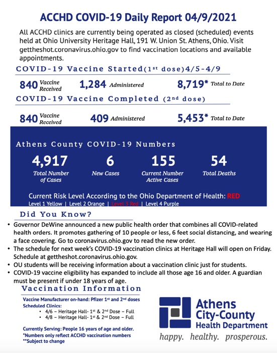 ATHENS Ohio WOUB Athens County has now had 4974 total cases of COVID-19 after eight new cases were reported Wednesday. The Ohio Department of Health confirmed the new cases on April 14 2021. ATHENS Ohio WOUB Athens County has now had 5070 total cases of COVID-19 since the beginning of the pandemic after 32 were reported Tuesday.