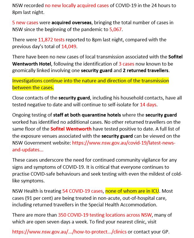 NSW recorded no new locally acquired cases of COVID-19 in the 24 hours to 8pm last night. NSW authorities are concerned about a number of Covid-19 cases in the past six weeks where the source was unknown. NSW Health - Latest COVID-19 news and updates.