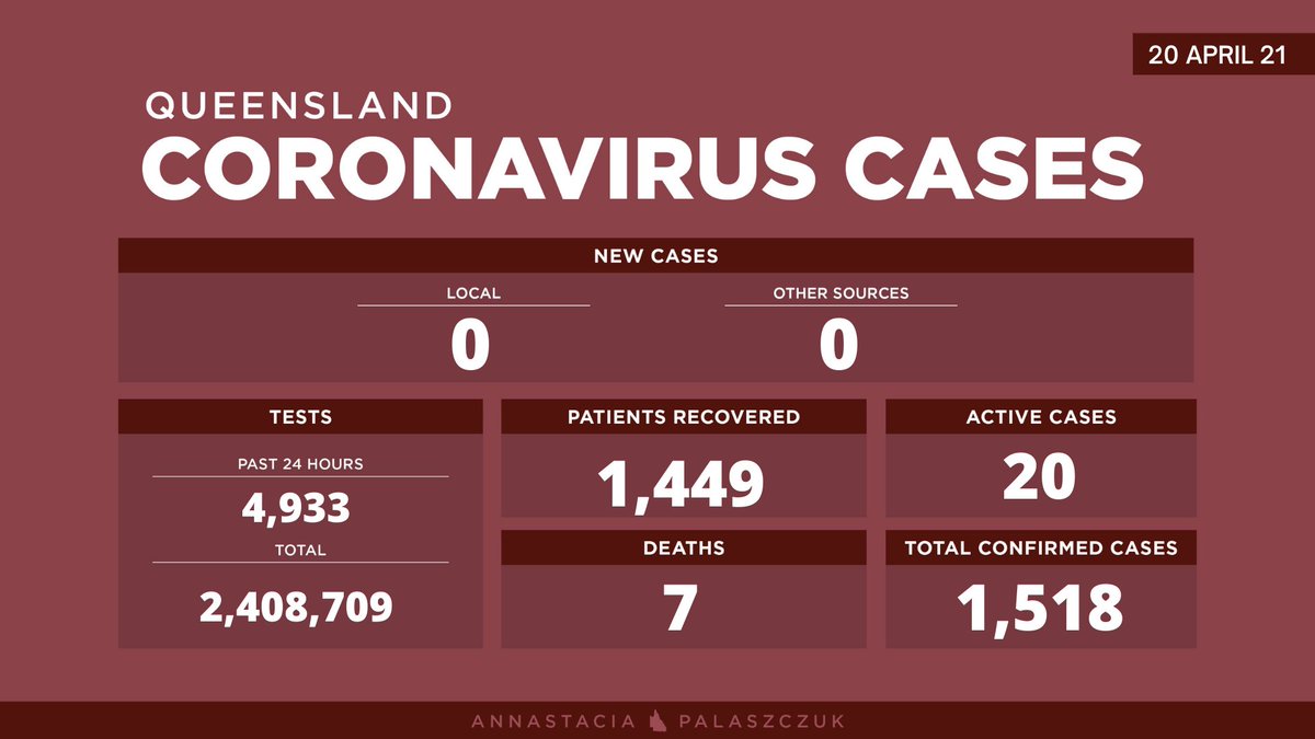Queensland has no new recorded cases of COVID-19 with five active cases remaining in the state. Live tracking of Coronavirus Cases Active Cases Tests Recoveries Deaths ICU and Hospitalisations in Queensland. Total case numbers include both confirmed and probable COVID-19 cases as per the national case definition.
