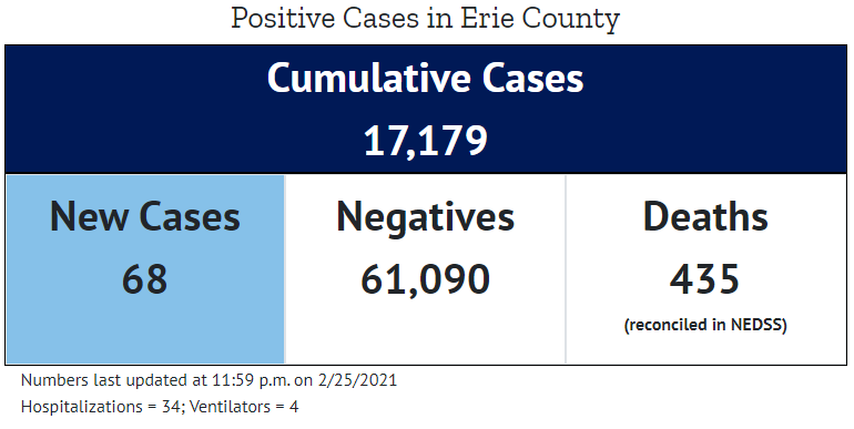Posted on Apr 16 2021 by Melissa Dixon. Erie County has 3630 total cases of COVID-19 since the pandemic started.